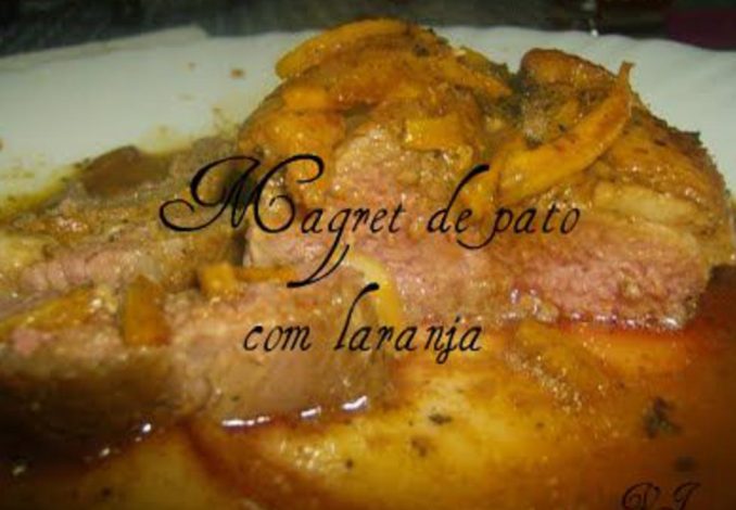- Corte a parte de cima da pele dos peitos de pato em losângulos. - Faça uma marinada com o sumo de laranja, sal e o alho em pó e junte os peitos de pato, deixando nesta marinada cerca de 20m. Reserve algumas cascas de laranja e corte-as em tirinhas finas. - Depois, coloque um fio de azeite numa frigideira e aloure o peito de pato, começando por alourar a parte da pele, para largar a gordura. - Depois de alourado, junte a marinada, as cascas de laranja ,baixe o lume e deixe a carne cozinhar. Se o molho evaporar muito, acrescente um pouco de vinho branco. - Sirva o magret de pato com o molho.