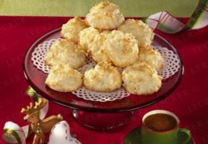 Aqueca o acucar com 100 g de coco ralado e as claras de ovo numa panela mexendo sempre a temperatura de aproximadamente 50 ° C. Tire a panela do calor lume, envolva o restantes de coco ralado a massa anterior. Distribua as hostias de bolachas em 2 tabuleiros forrados com papel manteiga e coloque montinhos de massa de coco unifomemente com ajuda de 2 colheres de cha sobre as hostias. Leve a cozer em forno pre-aquecido a 175 ° C / circulação de ar: 150 ° C por cerca de 15-20 minutos ate dourar. Retire as makronen de coco do forno e deixe arrefecer sobre uma grade.