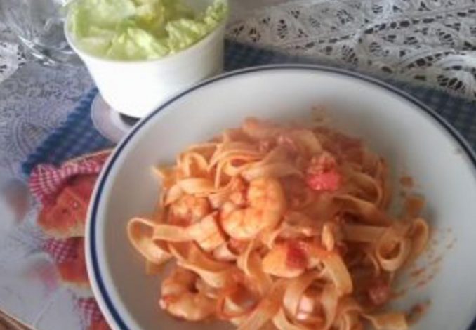 Retire as delícias do mar do frio (para começarem a descongelar). Passe o miolo de camarão e de ameijoa por água quente e reserve (se preferir pode cozer-los em água durante 3/4 minutos e depois usar a água da cozedura para a massa). Coloque a massa a cozer, em água a ferver, com sal e um fio de azeite. Quando estiver cozida escorra-a e reserve. Num tacho, pique a cebola e o alho e refogue-os com um fio de azeite. Quando estiverem alourados junte a água e a polpa de tomate. Quando levantar fervura coloque o marisco e tempere a gosto com o sal, a pimenta, os óregãos e o tomilho. Deixe apurar. Corte as delícias do mar em pedaços pequenos. Junte a massa ao refugado. Envolva tudo muito bem. Por fim junte as delícias. Deixe por mais 5 minutos, mexendo de vez enquando. Pode servir com salada de alface.