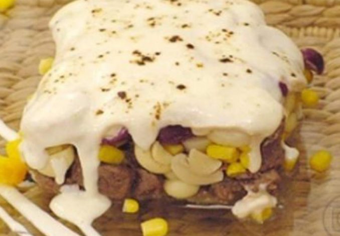 Numa panela com 2 colheres (sopa) de margarina sem sal, refogue 3 dentes de alho amassados e 1 cebola média picadinha, até dourar. Acrescente 800 g de filé mignon (ou 800 g de coxão mole), cortado em cubinhos e refogue mais um pouco até soltar o seu suco (por cerca de 5 min). Em seguida, junte 1 1/2 tablete de caldo de carne e o suco de 2 limões. Cozinhe em fogo brando até a carne amolecer (por mais ou menos 5 min). Obs.:se fizer com coxão mole, nesta etapa coloque junto 500 ml de água para a carne cozinhar. Quando a carne estiver macia, retire-a aos poucos, com auxílio de uma escumadeira, de forma que o caldo continue na panela. Peneire sobre este molho 1 1/2 colher (sopa) de farinha de trigo mexendo até engrossar. Acrescente 1 lata de creme de leite com soro. Desligue o fogo e reserve. Para a montagem Num refratário (23 cm x 22 cm x 4 cm), monte 1 camada de filé mignon (ou coxão mole) cozido, 200 g de champignons laminados, 300 g de palmito cortado em rodelas, 1 lata de milho verde escorrido, 150 g de azeitonas pretas cortadas em rodelas, molho reservado, 2 copos de requeijão cremoso. Leve ao forno pré-aquecido a 200ºC por 15 min para gratinar.