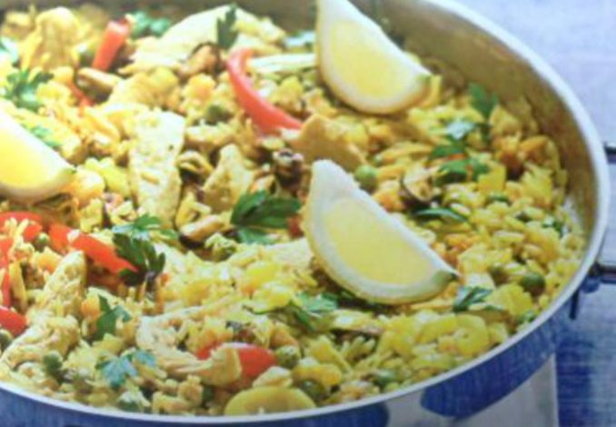 1- Derreta a Vaqueiro numa paellera, adicione o frango e deixe cozinhar sobre lume médio a forte até a carne estar dourada.