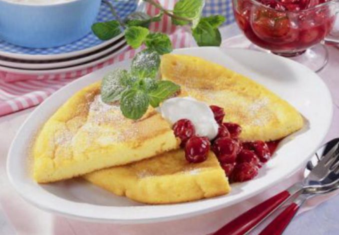 4- Misture o restante quark com o joghurt ate obter um creme liso. Parta a panqueca em pedacos grandes e sirva com com as cerejas de baunilha e o creme de joghurt e quark.