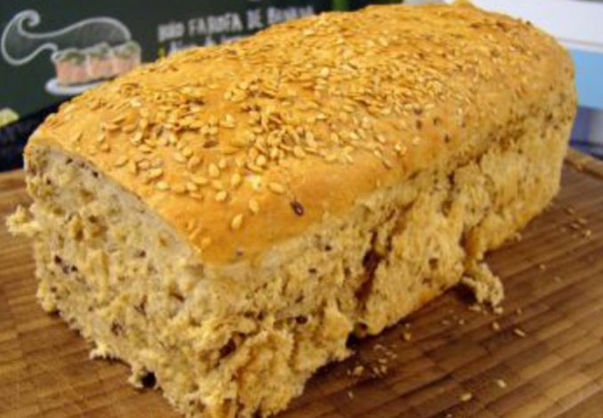 Para a massa, coloque todos os ingredientes em uma vasilha com exceção da farinha e misture bem. Em seguida, coloque a farinha aos poucos e vá misturando até obter uma massa enxuta. Então, sove muito bem com as mãos até que fique lisa e homogênea. Coloque em uma vasilha, pincele a água, polvilhe a linhaça, aperte bem com as mãos para ela grudar, cubra com um pano e deixe fermentar por 40 minutos aproximadamente ou até que a massa fique próxima da borda da assadeira. Leve ao forno moderado (180ºC) por aproximadamente 45 minutos ou até que fique bem dourado.