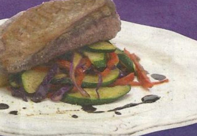 Divida a courgette ao meio no sentido do comprimento, cortando depois em meias-luas. O pimento e a beterraba deverão ser finamente cortados. Leve então a saltear em azeite estes três legumes, previamente temperados com sal e pimenta.