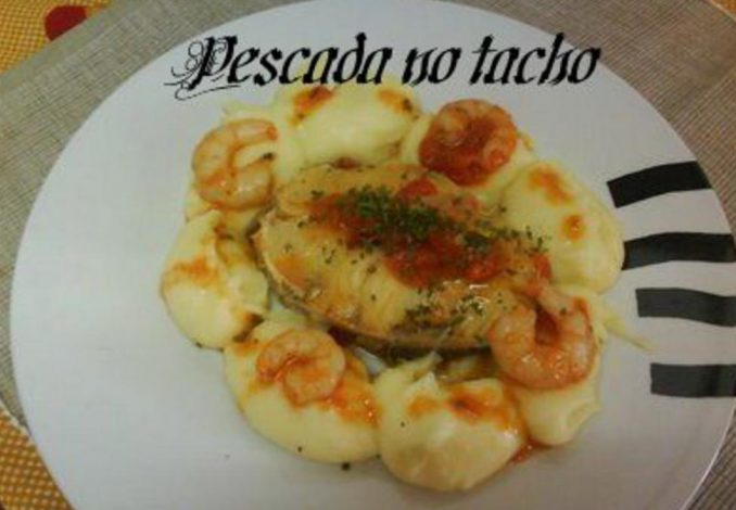1- num tacho coloquei o azeite,a cebola picada, o louro, o alho e o tomate sem pele. Deixei refogar e juntei as postas de pescada(previamente temperadas de sal), deixei ganhar cor e virei, acrescentei então o vinho branco, tapei e deixei cozinhar. 2 - Numa frigideira acrescentei um pouco de azeite e um pouco de tomate e refoguei ligeiramente. acrescentei sal, pimenta e pimentão doce e salteie os camarões. 3 - Depois de cozida a pescada, servi com os camarões e o púre