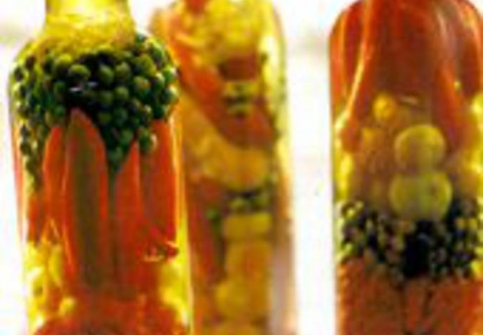 Em seguida, pegue dois vidros médios esterelizados com tampa, com capacidade para 1/2 litro cada um e faça camadas alternadas das pimentas. Despeje o azeite com o alho, cobrindo as pimentas e tampe os vidros.