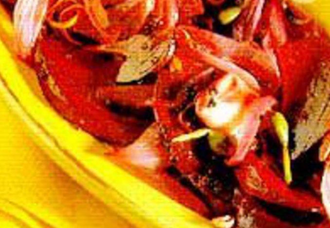 Refogue as cebolas em uma penala com o azeite e a mesma quantidade de água. Descasque as beterrabas e corte-as em fatias não muito finas. Assim que as cebolas estiverem macias, junte a beterraba, a mostarda em grãos, a casca de limão e o cardamomo. Cozinhe em fogo alto por alguns minutos. Regue com o vinagre e deixe evaporar parcialmente, em fogo alto. Tampe a panela e deixe em fogo baixo por mais 15 minutos, até que a beterraba esteja macia, mas firme. Adicione a mostarda de dijon e o açúcar. Polvilhe com a pimenta, mexa bem e cozinhe por mais 5-6 minutos, com a panela tampada, até que a beterraba esteja levemente "al dente". Junte as alcaparras, deixe no fogo por mais 2-3 minutos e sirva.