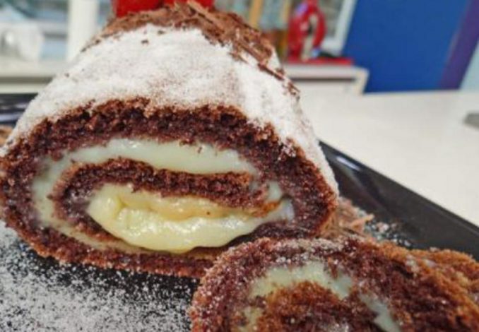 Em uma assadeira (35 cm X 20 cm) untada com bastante manteiga, despeje 1 lata de leite condensado forrando o fundo da assadeira e espalhando bem. Sobre este leite condensado, coloque a massa da batedeira (feita acima) e leve ao forno médio pré-aquecido a 180°C por 40 minutos. Retire do forno e desenforme sobre um pano polvilhado com açúcar. Enrole ainda quente e sirva em seguida.
