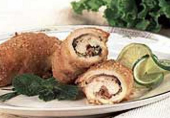 Corte o filé de frango em 4 bifes, coloque-os entre duas folhas de papel-manteiga e bata delicadamente com um batedor de carne. Tempere-os com sal e o suco de limão, abra-os e espalhe o bacon e as folhas de hortelã. Enrole os bifes, prenda-os com um palito e reserve.