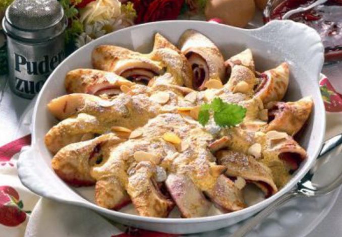 3- Unte uma forma plana de ir ao forno com manteiga e ponha os rolinhos de panqueca decorativamente dentro da forma e regue com as natas. Separe 1 ovo da gema e clara. Bata cremosamente a gema de ovo com o acucar de baunilha. Bata a clara em castelo bem rigida e envolva com a massa de ovo e distribua por cima dos rolinhos de panquecas e polvilhe com as amendoas fatiadas.
