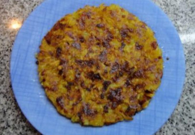 Descascar as batatas e ralá-las no corte mais grosso do ralador. Secá-las muito bem com papel de cozinha (é muito importante que fiquem o mais secas possível). Temperar com sal, pimenta e alecrim. Cortar o bacon em cubos pequeninos e ralar o queijo. Juntar às batatas. Numa frigideira anti-aderente, colocar um pouco de azeite em lume médio. Assim que estiver quente, reduzir para lume baixo e cobrir o fundo da frigideira com as batatas raladas sem deixar nenhum espaço. Deixar cozinhar 15 minutos sem mexer. Após os 15 minutos, virar com uma espátula ou com a ajuda de um prato, e colocar um pouco mais de azeite. Deixar cozinhar novamente 15 minutos. Pode servir-se como refeição ligeira ou como acompanhamento.