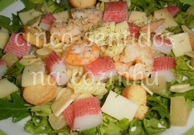 - Disponha-a sobre os legumes verdes, junte o miolo de camarão, as delicias do mar cortadas em 3 ou 4 partes, os croutons, o queijo e o ananás e polvilhe com endro.