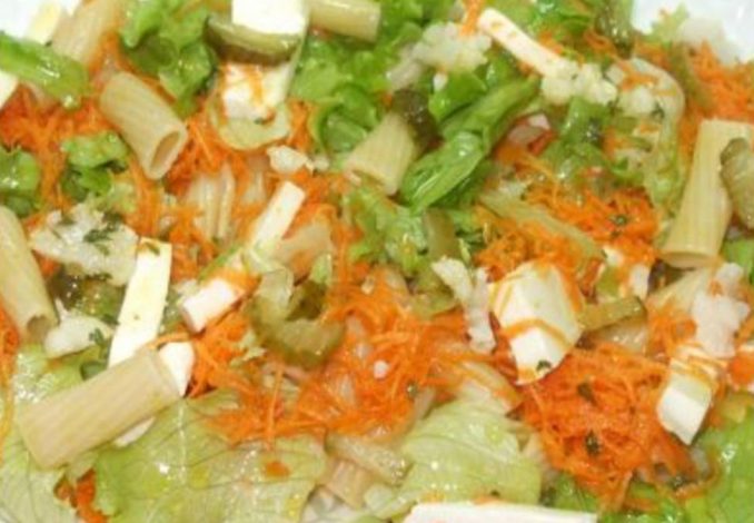 Lava-se a alface e rasgam-se as folhas em pedaços. Coloca-se numa travessa. Por cima põe-se a massa que já foi cozida (deve estar fria para não cozer a alface), a cenoura ralada, o queijo fresco cortado em pedaços, e pickles cortados em pedacinhos. Rega-se com o molho (receita à parte), apenas na altura de servir.