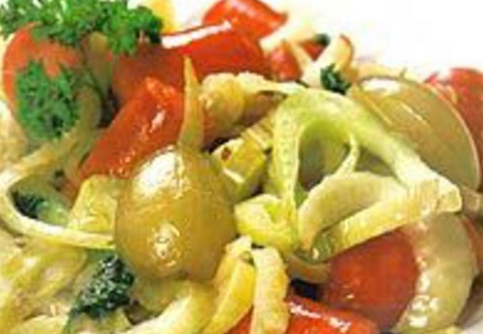 Aqueça o azeite de oliva em uma frigideira, junte a linguiça e salteie por 5 minutos, ou até ficar dourada e cozida. Acrescente a erva-doce,a minicebola, a salsinha e o sal. Cozinhe por mais 3 minutos, salteando de vez em quando, ou até a erva-doce ficar al dente.