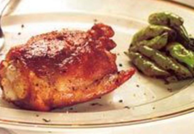 Tempere as sobrecoxas com sal e coloque numa frigideira antiaderente com o óleo bem quente e o curry. Frite, apertando a carne com uma espátula por 30 minutos, ou até dourar e ficar macia. Durante o cozimento aperte a sobrecoxa suavemente para que fique cozida na parte interna e vá adicionando colheradas de água.