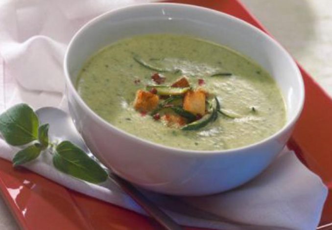 4- Reduza a sopa a pure Puré. Misture a sopa as natas e o courgette as tiras deixe ferver e cozinhar mais 1-2 min. Tempere com sal e pimenta. Polvilhe a sopa com os croutons e a salsa. Acompanhe com azeitonas verdes.