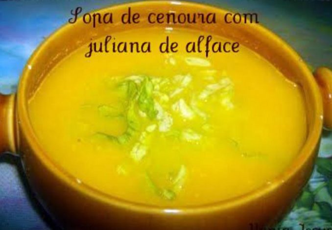 - Corte e lave as cenouras, as cebolas , as batatas e o tomate(tire a pele e as sementes). - Num tacho coloque a água ao lume temperada de sal e um fio de azeite e quando a água ferver junte os legumes e deixe cozer. - Depois dos legumes estarem cozidos triture a sopa em puré. - Lave as folhas de alface e corte-as em juliana em fina. - Junte a juliana de alface à sopa e sirva.