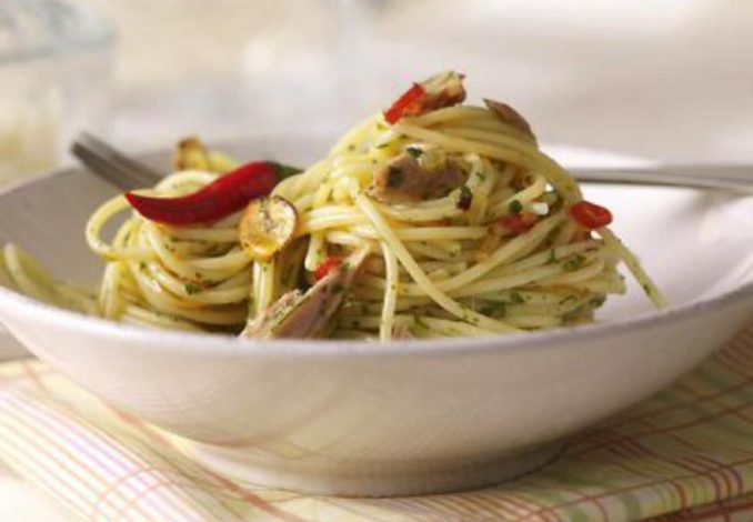 3- Escorra a lata de atum e esmague grosseiramente com um garfo. Retire 3-4 colheres de sopa de agua de cozimento da esparguete e escorra a esparguete. Adicione a esparguete e a agua da esparguete na frigideira e adicione o atum e ervas congeladas mexa bem e deixe aquecer tudo brevemente. Se for necessario tempere com sal e pimenta e serva.