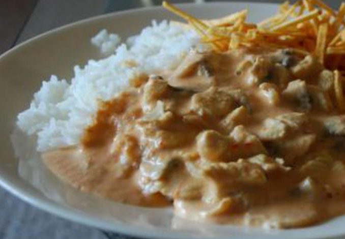 1. Numa panela, derreta a manteiga e refogue a cebola, junte o frango, a mostarda, o molho inglês e o Ketchup. 2. Misture bem até levantar fervura, então junte a polpa de tomate, a água, os cogumelos e o sal à gosto. 3. Deixe cozinhar até formar um molho grosso, abaixe o o fogo e coloque o creme de leite sem para de mexer até aquecer sem deixar ferver. 4. Sirva quente com arroz branco e batata palha.