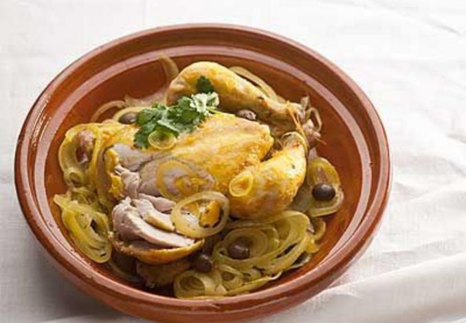 Ligue o forno e regule-o para os 160 º C Descasque as cebolas, corte-as em rodelas e espalhe-as sobre o fundo de uma tagine. Pele um pedaço de raiz de gengibre, rale-a e esprema o suco. Junte ao suco de gengibre o açafrão e a Vaqueiro Alho. Esmague com um garfo e misture tudo até obter um a pasta homogénea. Esfregue o frango por dentro e por fora com a pasta preparada e coloque-o sobre a cama de cebolas. Junte o pau de canela e regue com os cubos Knorr, dissolvidos na água a ferver. Cubra a tagine com a tampa e leve ao forno durante cerca de 1 hora. Dissolva a Maizena no sumo do limão e perfume com coentros picados. Adicione esta mistura ao caldo do frango, junte as azeitonas e leve ao forno durante mais 10 a 15 minutos sem a tampa. . . . . . . . . . Sugestão: Sirva com arroz branco, solto