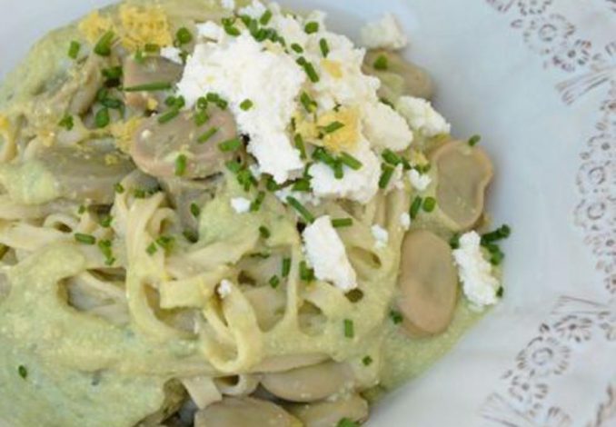 Colocar a massa escorrida juntamente com as favas no tacho e adicionar o molho verde, envolvendo suavemente.