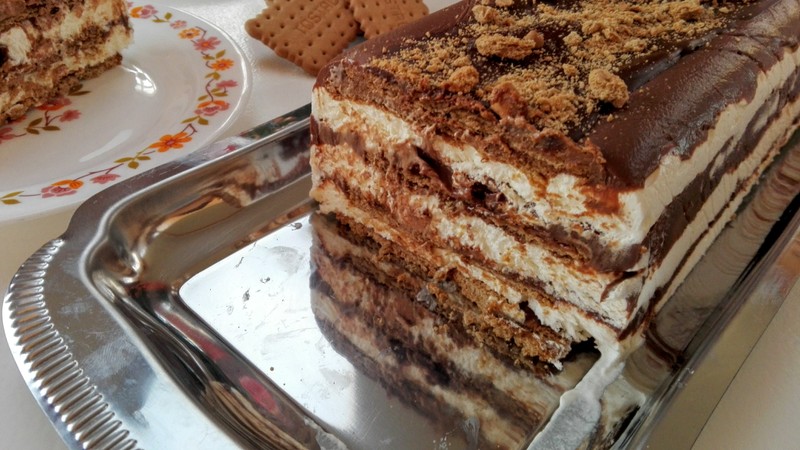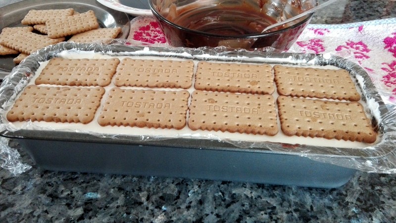 Repetir, camada de bolachas, chocolate, caramelo, bolachas e natas, sendo a última camada de bolachas;