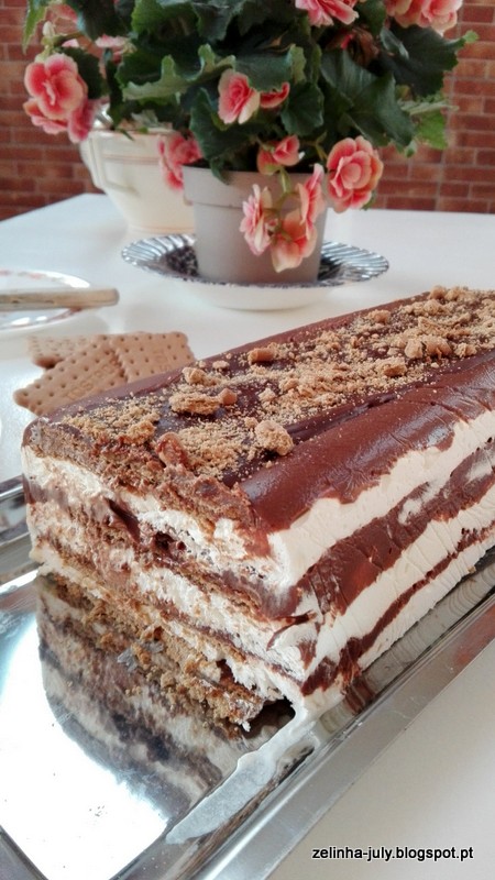 Tarte gelada de natas, chocolate, caramelo e bolachas