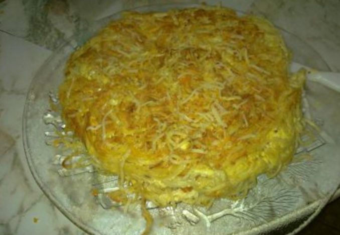 Coza o esparguete. Escalde 3 tomates com água a ferver e pele-os- Corte-os ao meio, retire as sementes e corte em rodelas. Derreta 75g de margarina e deite sobre o esparguete. Misture. Bata os ovos com o manjericão picado e o queijo ralado. Misture com o esparguete. Numa frigideira, derreta 15g de margarina, junte metade do esparguete e alise a superfície. Cubra com o salame em fatias, o tomate e o queijo. Tape com o restante esparguete. Coza a tortilha em lume médio cerca de 10 minutos. Com a ajuda de uma espátula, solte a tortilha e faça-a deslizar para uma tampa. Vire a tortilha para a frigideira e introduza no fundo 15g de margarina. Deixe cozer mais 5 minutos. Faça deslizar a tortilha para um prato de serviço e sirva imediatamente.
