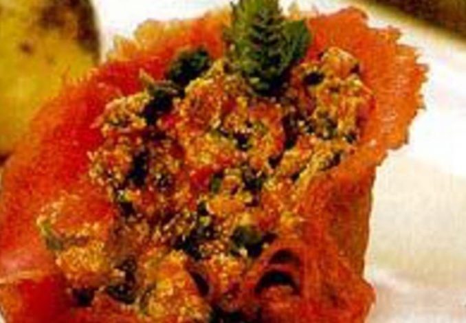 Lave o manjericão, seque-o, separe somente as folhas e coloque no processador. Junte o pimentão, a ricota, o azeite de oliva, a páprica e o sal e bata até obter uma pasta. Recheie o carpaccio e distribua nos pratos. Se preferir, decore com folhas ou flores de manjericão.