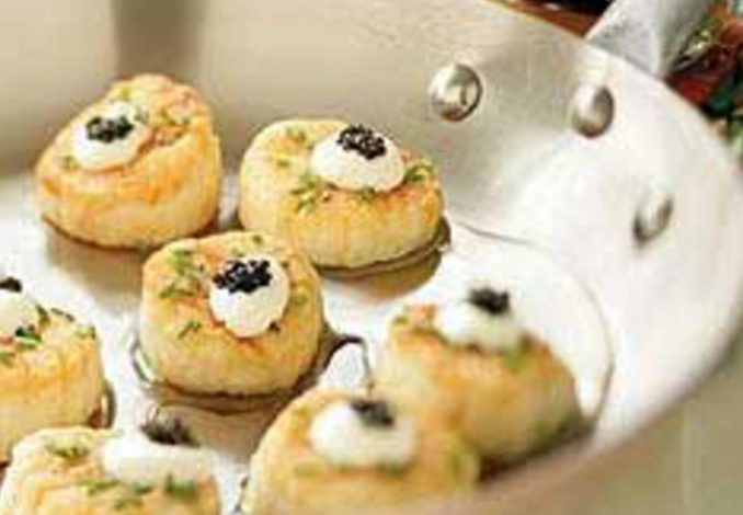 1. Tempere as vieiras com sal e pimenta. Ponha os ovos, a farinha e o pão ralado em três recipientes separados. Envolva as vieiras na farinha. Sacuda o excesso, mergulhe nos ovos e finalmente cubra com pão ralado. Conserve no frigorífico até fritar. 2. Aqueça uma wok ou uma frigideira pequena de base pesada. Deite o óleo e aqueça até que, deitando um pouco de pão, este comece a crepitar. Frite as vieiras, cerca de três a quatro de cada vez, até ficarem douradas. Escorra. Fatie o cebolinho em juliana fina e enrole com a ponta de uma faca. Sirva os bolos quentes, decorados com o cebolinho enrolado e gomos de lima, e acompanhados de maionese wasabi.