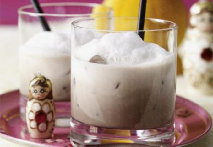 Aqueça 75 ml de leite. Coloque o gelo em copos de whiskey, distribua o vodka e o licor de café nos copos e misture tudo muito bem. Deixe escorre o leite com uma colher nos copos, bata o leite morno até obter espuma e distribua nos copos com a bebida. Sirva com palhinhas.