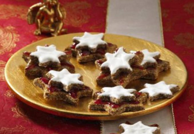Peneire finamente o açúcar em pó. Bata as claras de ovo com o sal em castelo bem firmes e finalmente adicione o açúcar em pó à colherada nas claras, mexendo sempre. Reserve cerca de 3 colheres de sopa de mistura de açúcar e claras para barrar as estrelas. Misture o açúcar de baunilha e a canela no restante batido. Adicione as amêndoas o suficiente até que a massa não cole. Polvilhe a superfície de trabalho com açúcar em pó. Estique a massa de 0,5 cm de espessura, corte estrelas de 2 tamanhos diferentes (6 + 4,5 cm Ø). Coloque as estrelas em 2-3 tabuleiros forrados com papel manteiga e pincele as estrelas pequenas com o batido de claras que reservou. Leve os tabuleiros um após um a assar em forno pré-aquecido 125 ° C por cerca de 18-20 minutos. Retire do forno e deixe arrefecer sobre uma grade. Passe a geleia através de um passador e despeje num saco pequeno de pasteleiro. Injecte a geleia sobre as estrelas grandes e coloque as estrelas pequenas sobre as grandes. Manter bem fechado em lugar fresco e seco.